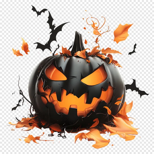 Tags: 3D render Halloween Halloween decoration autumn leaves bats black pumpkin creepy dark theme digital art fall festive free download glowing jack-o-lantern modern Halloween orange glow pumpkin face scary spooky transparent PNG