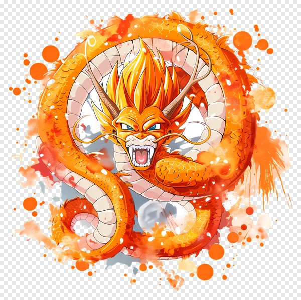 Tags: Orange dragon Shenron inspired Super Saiyan anime dragon blue eyes digital art dynamic art fangs fantasy creature fiery dragon free download golden dragon graphic design horns mythical beast powerful scales transparent PNG vibrant watercolor effect