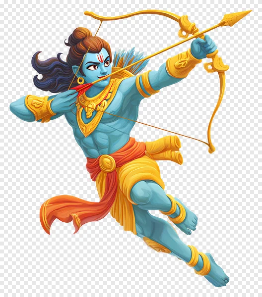 Download this vibrant and high-quality Lord Rama cartoon PNG for free! This stunning illustration features the revered Hindu warrior deity, Lord Ram, with his iconic blue skin, majestic golden ornaments, and a powerful, poised stance, drawing a golden bow and arrow. Perfect for cultural projects, religious content, festival designs (like Diwali or Dussehra), educational materials, or adding a powerful mythological touch to your creative works. The transparent background ensures seamless integration into any design. Get this detailed and compelling depiction of Lord Rama, ready to inspire and uplift, available for instant free download and easy use.