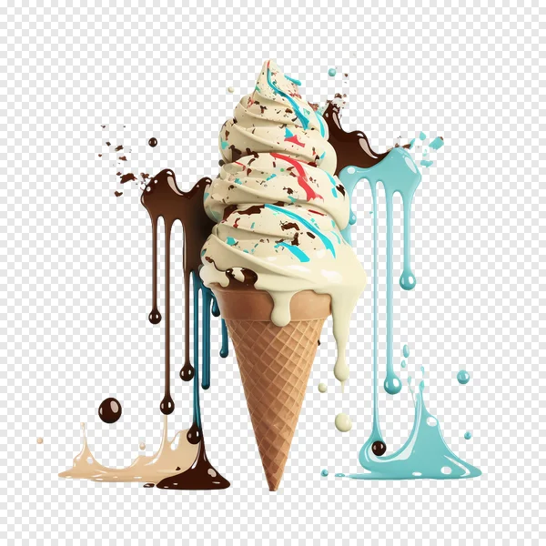 Indulge your senses with this vibrant free PNG of a melting ice cream cone! Featuring rich vanilla soft serve intricately drizzled with chocolate and eye-catching blue and red toppings, all cascading down a classic waffle cone. Dynamic drips and splashes of chocolate, light blue, and creamy white create an energetic, appetizing scene. Rendered on a transparent background, this high-quality image is perfect for graphic design, marketing materials, menu enhancements, social media, or any digital project needing a delicious, colorful touch. Download this high-resolution, SEO-friendly melting ice cream PNG today to add a sweet, refreshing flair to your designs and captivate your audience!