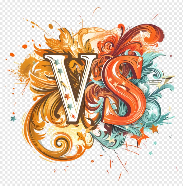 Unleash your creative potential with this stunning 'VS' letters PNG, available for free download! This dynamic graphic features highly decorative and ornate 'VS' characters, set against a backdrop of vibrant orange, brown, and teal swirls, intricate floral patterns, and edgy grunge paint splatters. Adorned with subtle stars, this versatile design is perfect for illustrating competition, comparison, gaming matchups, sports events, or any project requiring a striking contrast. Ideal for posters, social media, web banners, and more. Download now and add a powerful visual statement to your next design!
