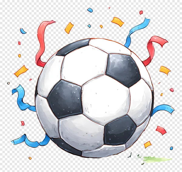Kick off your designs with this vibrant and energetic Soccer Ball Celebration PNG! Featuring a classic black and white football surrounded by a burst of colorful confetti (yellow, red, blue) and flowing red and blue ribbons, this transparent image is perfect for capturing the excitement of game day, championships, or any sports victory. The detailed illustration style adds a dynamic and celebratory touch to your projects. Ideal for posters, social media graphics, websites, party invitations, presentations, and more. Download this high-quality, free PNG to instantly add a winning spirit to your next design. Get ready to score big!