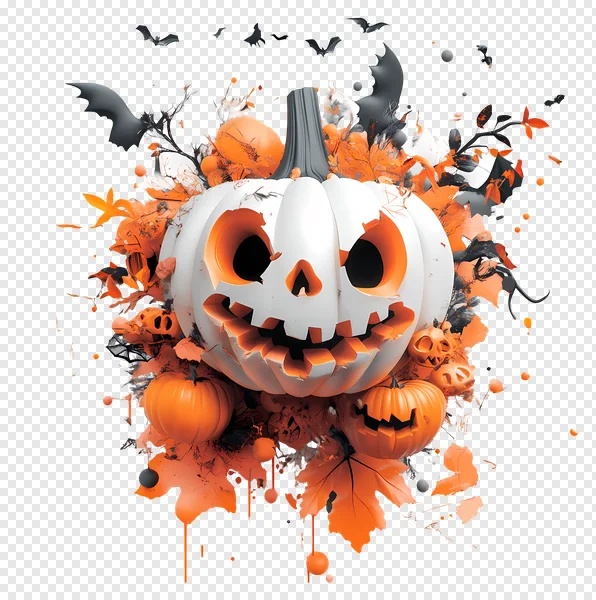 Tags: Halloween Jack-o'-lantern autumn leaves black background creative assets digital art dynamic fall foliage festive flying bats free download graphic design illustration modern Halloween orange paint splatter seasonal spooky transparent PNG white pumpkin