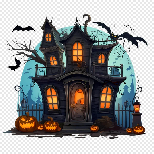 Step into the Halloween spirit with this captivating free PNG download featuring a classic spooky haunted house. This detailed cartoon illustration showcases a mysterious dark mansion with glowing orange windows, surrounded by grinning jack-o'-lanterns and shadowy flying bats. A gnarled bare tree and intricate spiderwebs add to the eerie charm, set against a moonlit teal sky. Perfect for Halloween party invitations, social media graphics, website banners, or creating festive digital art. Download this transparent background image instantly and add a touch of spooky fun to your projects!
