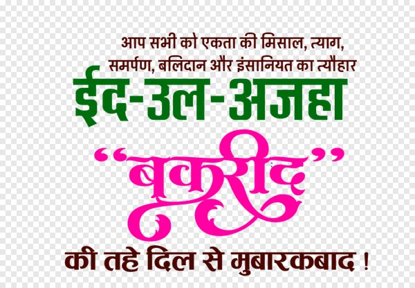 Tags: Bakrid Eid Mubarak Eid-ul-Adha Hindi greetings Islamic festival Muslim holiday Urdu wishes celebration devotion digital card festival wishes free PNG green calligraphy holiday wishes humanity pink text religious greetings sacrifice social media transparent background unity