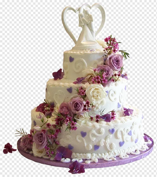 Download this stunning, high-quality PNG of an elegant 3-tier wedding cake for free! Featuring intricate white frosting, delicate lavender and white roses, charming purple heart accents, and a classic bride and groom heart-shaped topper, this transparent background image is perfect for wedding invitations, anniversary cards, celebration graphics, or any romantic design project. Enhance your digital creations with this beautiful dessert, symbolizing love and joyous occasions. Get your free download now and add a touch of sophistication to your visuals!