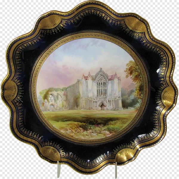 Discover this exquisite free PNG of an antique decorative plate, adorned with a stunning hand-painted landscape. The deep cobalt blue border, intricately detailed with rich gold scrollwork and a scalloped edge, frames a picturesque scene of a grand Gothic abbey nestled in lush greenery. Ideal for adding a touch of vintage elegance and historical charm to your digital projects, presentations, or creative designs. Download this high-quality, transparent background image now to enhance your artwork, scrapbooking, or website with a truly unique and artistic flair. Perfect for history buffs, art enthusiasts, and designers seeking sophisticated visual elements.