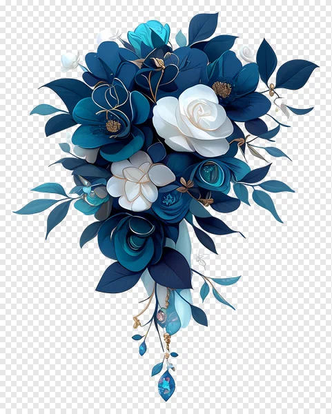 Elevate your designs with this stunning free PNG of an elegant blue and white floral bouquet. Featuring rich deep blue and vibrant turquoise blossoms complemented by pristine white flowers and delicate golden accents, this high-quality transparent image exudes luxury and sophistication. Perfect for wedding invitations, greeting cards, digital art, social media graphics, scrapbooking, or any creative project needing a touch of graceful beauty. Download this exquisite modern flower arrangement for free and add a chic, refined element to your next design. A versatile and eye-catching graphic, ready for instant use!