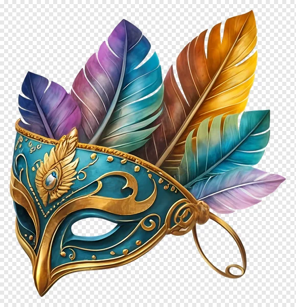 Download this stunning, high-resolution carnival mask PNG for free! Featuring a beautiful teal base accented with intricate gold detailing and vibrant, colorful feathers, this image is perfect for Mardi Gras designs, masquerade ball invitations, fantasy art, costume parties, and more. Use it to add a touch of elegance and mystery to your projects. Transparent background for easy integration. Get your free download now!
