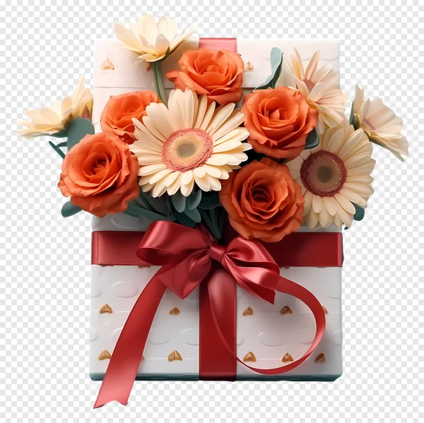 Tags: Gift box PNG anniversary birthday bow celebration cream daisies cutout elegant gift floral bouquet floral present flowers gerbera daisies isolated love orange roses present red ribbon special occasion transparent background white box