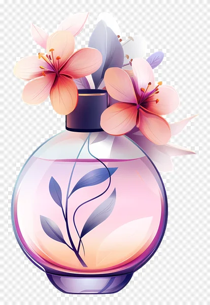 Download this exquisite floral perfume bottle PNG image for free, featuring a beautifully illustrated clear glass bottle filled with a gradient pink and purple liquid, adorned with delicate peach-pink flowers and elegant blue leaves. This aesthetic, watercolor-style fragrance illustration with its transparent background is perfect for adding a touch of luxury and femininity to your creative projects. Ideal for beauty product branding, graphic design, social media content, website elements, or stylish digital art. Enhance your designs with this high-quality, free-to-download PNG!