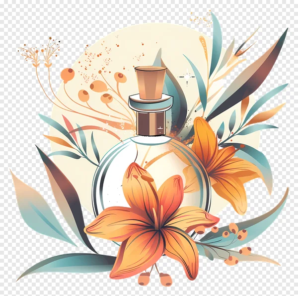 Discover this exquisite free PNG of an elegant perfume bottle, beautifully framed by vibrant orange lilies and lush teal botanical leaves. The clear glass bottle with its charming wooden cork stands out against a creamy, speckled circle, creating a captivating and sophisticated design. Perfect for beauty blogs, wellness branding, wedding invitations, digital scrapbooking, or adding a touch of floral elegance to any creative project. Download this high-quality, transparent image now to infuse your designs with natural beauty and a sense of delicate fragrance. Ideal for designers and content creators seeking unique, aesthetic graphic elements.