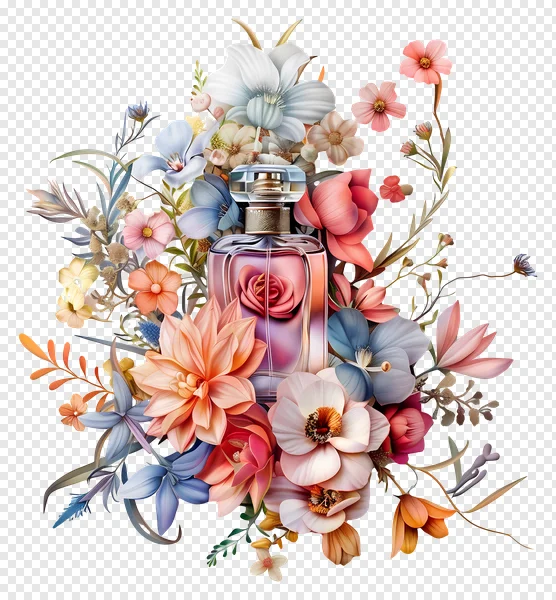 Discover this exquisite free PNG featuring an elegant perfume bottle nestled within a vibrant, lush floral arrangement. The rose-tinted fragrance bottle is beautifully surrounded by a diverse bouquet of pink, coral, white, blue, and peach blossoms, all set against a striking black background. This high-quality, transparent illustration is perfect for luxury branding, wedding invitations, beauty product design, digital art, website headers, social media graphics, or enhancing any creative project with a touch of sophistication. Download this unique floral perfume graphic for free and elevate your designs today!