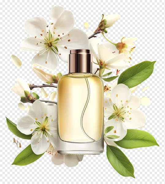 Elevate your designs with this exquisite free PNG image featuring a luxurious perfume bottle nestled amidst a vibrant cluster of delicate white spring flowers and lush green leaves, with petals gracefully falling. The elegant fragrance bottle showcases a radiant amber liquid and a sophisticated rose gold cap, perfect for conveying natural beauty and refined luxury. Ideal for cosmetic advertisements, beauty blogs, product mockups, or any project requiring a fresh, floral touch. Download this high-quality, transparent background PNG for free and add a touch of timeless elegance to your creative works.