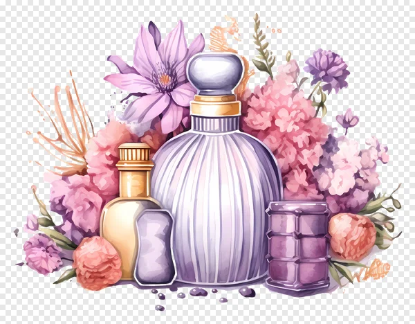 Download this exquisite free PNG featuring a luxurious collection of watercolor perfume bottles surrounded by lush, vibrant floral arrangements. This elegant illustration showcases various fragrance bottles in soft lavender, pink, and gold tones, accented by blooming flowers like peonies and lotus. Perfect for beauty blogs, cosmetic brand promotions, social media graphics, greeting cards, or adding a touch of sophisticated charm to any design project. Get this high-quality, transparent PNG to elevate your creative work today!