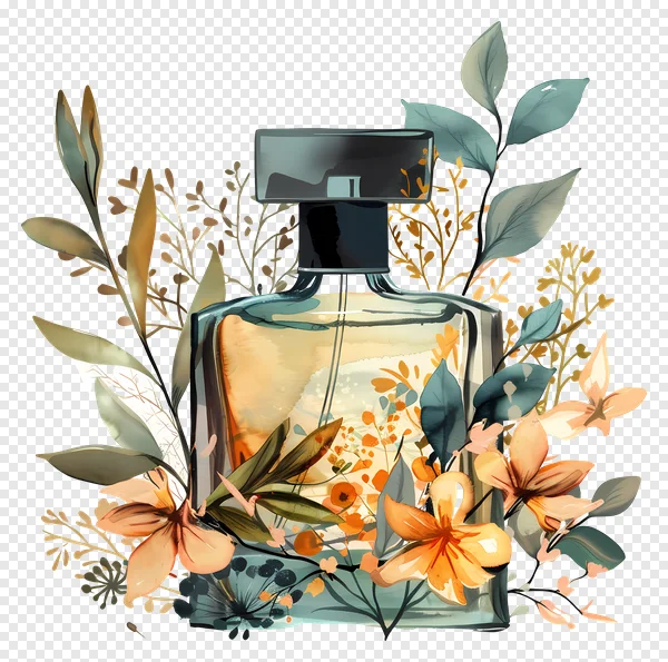 Download this exquisite transparent PNG of a watercolor perfume bottle, gracefully framed by lush botanical elements. Featuring a stylish fragrance bottle with a warm, amber liquid, surrounded by vibrant orange flowers, delicate teal leaves, and intricate golden foliage, this artwork exudes sophistication. Perfect for adding a touch of natural beauty and luxury to beauty blogs, fashion designs, product promotions, wedding invitations, or any creative project. Get this high-quality, free botanical illustration to elevate your visual content with its artistic charm and serene aesthetic.