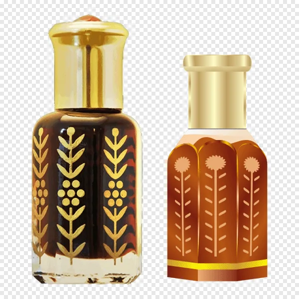 Discover our stunning free PNG image featuring two elegant perfume bottles, perfect for projects requiring a touch of luxury and exotic appeal. The first bottle showcases dark attar or oud oil with intricate gold leaf patterns, while the second is a stylized amber vial adorned with golden floral designs. Both bottles boast shiny gold caps and a transparent background, making them ideal for web design, digital art, e-commerce product mockups, or any creative endeavor. Enhance your visuals with these premium-looking fragrance icons. Download this high-quality, royalty-free graphic today and add sophistication to your designs instantly!