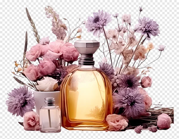 Discover this stunning free PNG image featuring a luxurious golden perfume bottle and a sleek transparent smaller bottle, elegantly nestled within a lavish bouquet. The vibrant composition showcases a blend of romantic pink roses, delicate purple blooms, and subtle white blossoms, all set against a transparent background for seamless integration into your designs. Ideal for beauty campaigns, social media graphics, wedding stationery, blog headers, or any project needing a touch of refined beauty and exquisite fragrance. Download this high-quality, SEO-friendly floral perfume image to elevate your creative projects with ease.