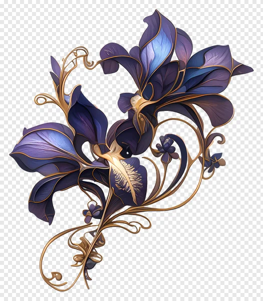 Tags: Art Nouveau baroque style botanical illustration decorative element digital art elegant design floral ornament free clip art gold flower golden accents graphic design indigo intricate detail luxury floral ornate floral purple flower sophisticated stylized iris transparent PNG violet