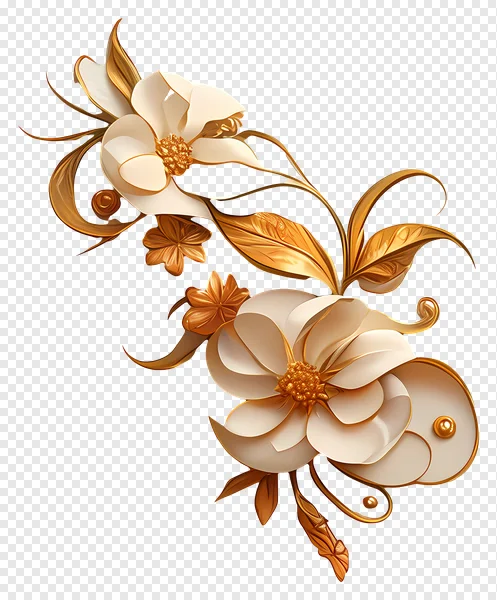 Download this stunning free PNG of an elegant floral design. Featuring luxurious cream and white flowers with intricate golden accents, delicate golden leaves, and decorative swirls, all set against a dramatic black background. This opulent, high-quality illustration is perfect for adding a touch of sophistication to your wedding invitations, greeting cards, digital art projects, scrapbooking, or graphic design work. Enhance your creative projects with this beautiful golden floral motif. Get your transparent PNG for instant use!