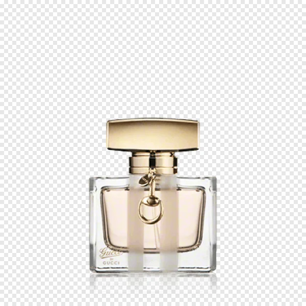 Download this stunning, high-quality PNG image of a luxurious Gucci by Gucci women's perfume bottle for free. This elegant fragrance features a clear glass rectangular bottle, a sophisticated gold cap, and the iconic gold horsebit charm dangling from the neck. Perfect for fashion blogs, e-commerce product mockups, beauty articles, digital art projects, or presentations. With its transparent background, this premium graphic integrates seamlessly into any design. Elevate your visuals with this exquisite Gucci fragrance bottle. Get your royalty-free PNG today!