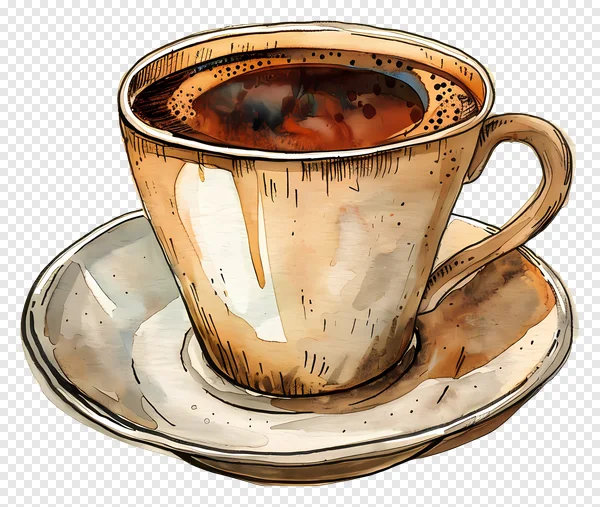 Download this captivating free PNG of an elegant watercolor coffee cup illustration. This beautifully hand-drawn artwork features a rich black coffee or espresso with subtle foam, resting gracefully on a classic saucer, all presented with a transparent background. Perfect for adding a cozy, artistic touch to your website, blog, menus, social media posts, or various digital design projects. Enhance your creative endeavors with this high-quality, free-to-download beverage graphic. Ideal for food bloggers, cafe promotions, morning routine themes, or any design needing a stylish and inviting coffee element. Get your transparent coffee cup illustration today!