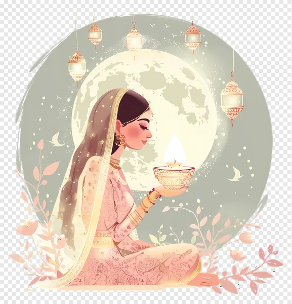 Tags: Diwali Eid Indian woman PNG Ramadan cultural digital art diya elegant festive full moon illustration lanterns moonlight night oil lamp serene spiritual traditional transparent background