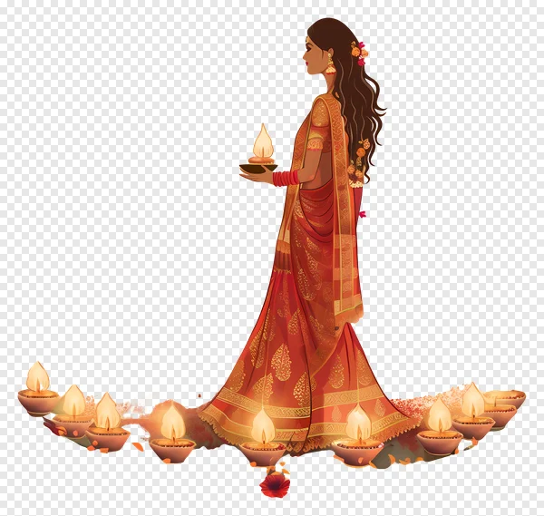 Tags: Diwali Hindu festival Indian attire Indian woman South Asian celebration clip art cultural art decorative diya lamp ethnic festive illustration festive lights free PNG graphic design oil lamp rangoli spiritual traditional saree transparent background