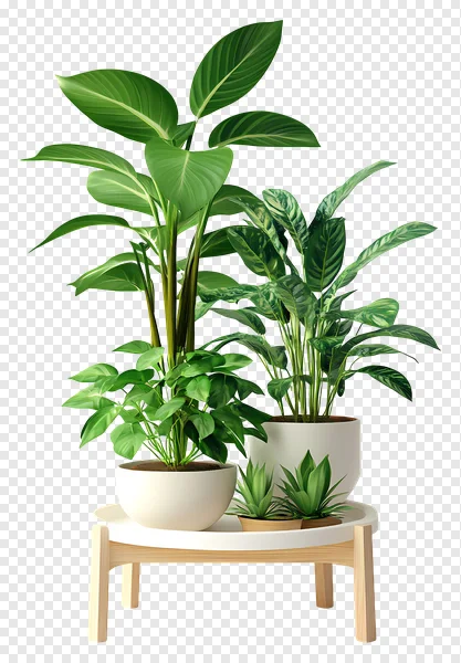 Download this exquisite, free PNG of elegant indoor potted plants for your next design project. This high-quality image features a vibrant collection of houseplants, including a tall plant with broad green leaves, a strikingly variegated plant, and a smaller succulent, all neatly arranged in white pots on a modern, light wooden table. The transparent background makes it perfect for seamless integration into websites, presentations, marketing materials, or digital art. Add a touch of natural beauty and contemporary home decor to your visuals effortlessly.