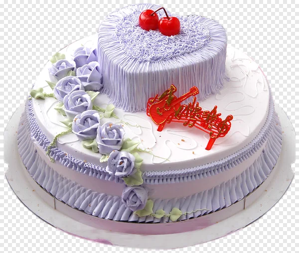 Download this exquisite free PNG of a two-tier celebration cake, perfect for birthdays, anniversaries, or special events. This high-resolution image features a charming heart-shaped top tier in delicate lavender, adorned with bright red cherries. The lower tier is beautifully decorated with intricate lavender icing roses, green leaves, and a fun red musical guitar & notes ornament. Ideal for invitations, greeting cards, website graphics, or any digital project. Get your transparent background PNG now!
