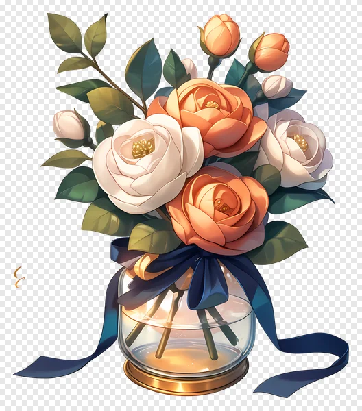 Download this exquisite transparent PNG of an elegant floral bouquet for free! This stunning digital illustration features beautiful peach and cream-colored camellia-like blooms and buds, accompanied by lush green leaves, all gracefully arranged in a clear glass vase with a golden base. A stylish dark blue ribbon adds a touch of sophistication to the arrangement. Perfect for graphic design projects, wedding invitations, digital scrapbooking, presentations, greeting cards, or adding a delicate touch to any creative work. The high-quality transparent background ensures easy integration into your designs. Elevate your projects with this free, aesthetic floral PNG today!