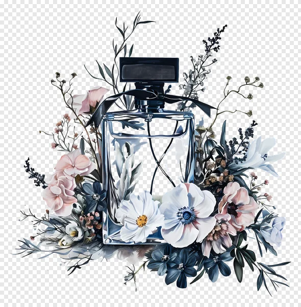 Discover this exquisite free PNG image featuring a stunning perfume bottle elegantly nestled amidst a vibrant and luxurious floral arrangement. The captivating digital artwork showcases delicate pink, crisp white, and deep blue flowers with lush, dark foliage, all set against a dramatic black background. This high-quality, transparent PNG is perfect for enhancing beauty blogs, fashion websites, social media posts, or any creative design project. Download now to add a touch of sophistication and natural elegance to your visuals, ideal for cosmetics branding, mood boards, or digital collages. Get your free graphic today!