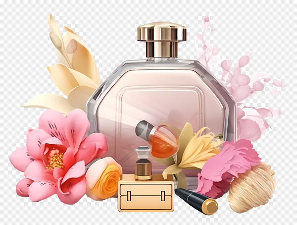 Download this stunning, high-quality PNG image featuring an elegant perfume bottle beautifully adorned with a luxurious arrangement of vibrant pink and soft gold flowers. This visually rich graphic also includes intricate details like a sleek gold-capped fragrance vial, a small cosmetic container, and a chic black-and-gold lipstick, all set against a transparent background for seamless integration into your creative projects. Perfect for beauty blogs, cosmetic advertising, feminine branding, digital art, social media content, and more. Elevate your designs with this free, sophisticated image that exudes charm and elegance. Get your free download now and add a touch of glamour!