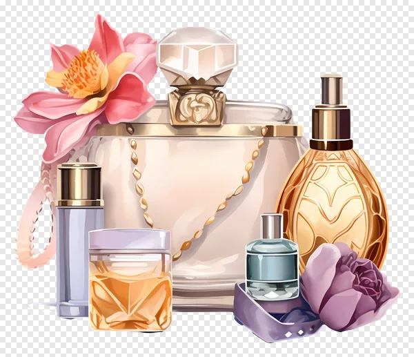 Download this exquisite free PNG featuring a stunning collection of luxury perfume bottles adorned with elegant pink and purple flowers. This beautiful transparent image showcases a variety of fragrance bottles in cream, gold, amber, and blue hues, perfectly complemented by delicate floral accents. Ideal for beauty blogs, cosmetic marketing materials, graphic design projects, invitations, or adding a touch of sophistication to any creative work. Get your high-quality, free-to-use perfume illustration with a transparent background today!