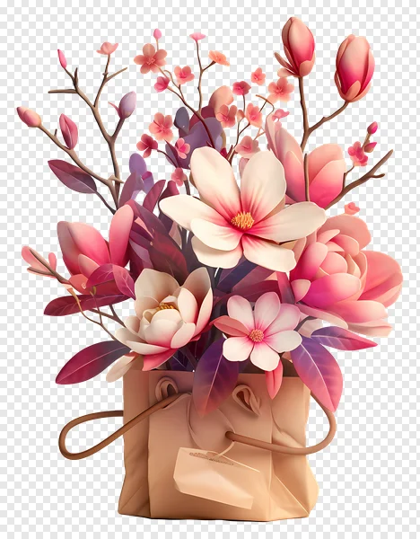 Download this exquisite free PNG image featuring a stunning bouquet of vibrant pink magnolias and delicate cherry blossoms, beautifully arranged in a stylish light beige gift bag. This high-quality floral illustration comes with a transparent background, making it perfect for seamless integration into various design projects. Ideal for creating captivating greeting cards, wedding invitations, digital scrapbooks, presentations, social media graphics, or adding a touch of spring elegance to any creative endeavor. Embrace the charm of blooming flowers and natural beauty with this versatile and captivating flower clipart. Get your free download now and infuse your designs with fresh, romantic floral aesthetics!