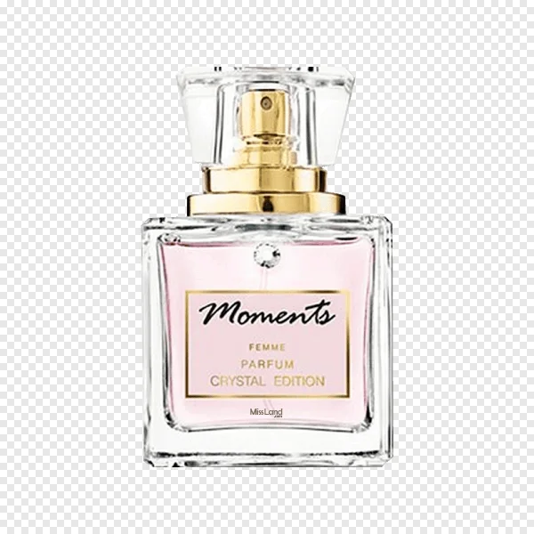 Discover the exquisite "Moments Femme Parfum Crystal Edition" perfume bottle, available as a high-quality, transparent PNG for your creative projects. This elegant image features a clear glass bottle filled with delicate pink fragrance, adorned with a sparkling crystal cap, golden sprayer, and a small embellishment. Perfect for beauty blogs, cosmetic marketing materials, graphic design, or adding a touch of luxury to your digital content. Highlighted by the distinctive "Moments" script and "MissLand" branding, this free download is ideal for creating sophisticated visuals. Enhance your designs with this beautiful women's perfume bottle today!