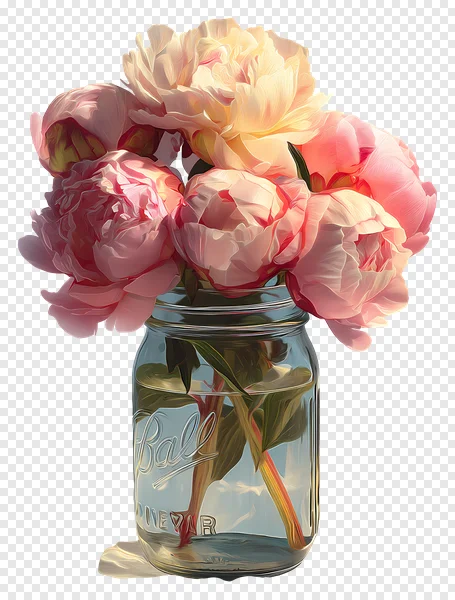 Discover the exquisite beauty of this free PNG featuring a lush bouquet of soft pink peonies artfully arranged in a clear glass Ball mason jar. The vibrant, delicate blooms with their intricate petals are set against a transparent background, making it perfect for seamless integration into any design project. Ideal for wedding invitations, greeting cards, digital scrapbooking, website graphics, or adding a touch of elegant nature to your creative endeavors. Download this high-quality floral image instantly and elevate your visuals with grace and charm.