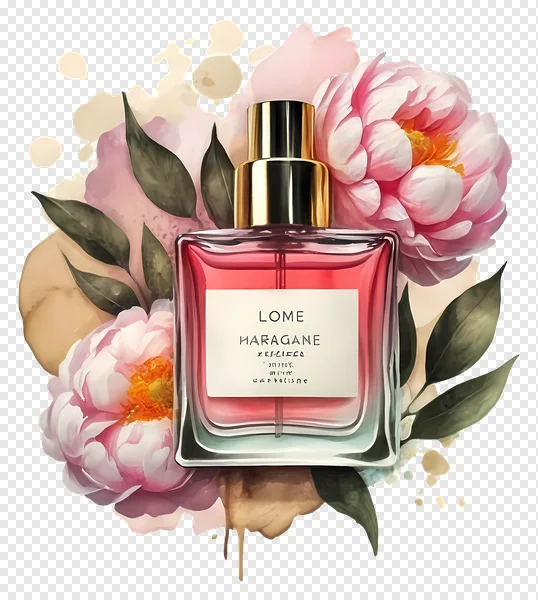 Elevate your design projects with this stunning free PNG featuring an elegant pink perfume bottle adorned with lush peonies and vibrant green leaves. The luxurious fragrance bottle, with its chic gold cap and 'LOME HARAGANE' label, is set against artistic watercolor splashes and a dark background. Perfect for beauty blogs, cosmetic advertisements, feminine branding, or adding a touch of floral sophistication to any graphic design. Download this high-quality, transparent PNG image today for your personal or commercial creative endeavors!