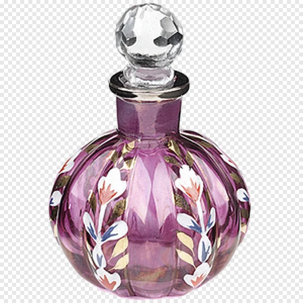 Discover this exquisite vintage purple glass perfume bottle PNG, perfect for adding a touch of elegance to your design projects. Featuring a beautiful fluted body, delicate hand-painted floral patterns in white, peach, and blue, and a sparkling faceted crystal stopper, this transparent background image is ideal for mood boards, digital art, or personal use. Its rich amethyst hue and classic design evoke luxury and nostalgia. Download this high-quality, free PNG of a decorative fragrance decanter and enhance your creative work instantly!