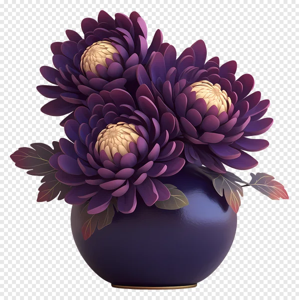 Tags: bouquet chrysanthemums dark purple decorative vase digital art elegant floral floral illustration flower arrangement free PNG gold flowers golden centers indigo vase luxury flowers modern floral petals purple flowers stylized flowers transparent background vibrant