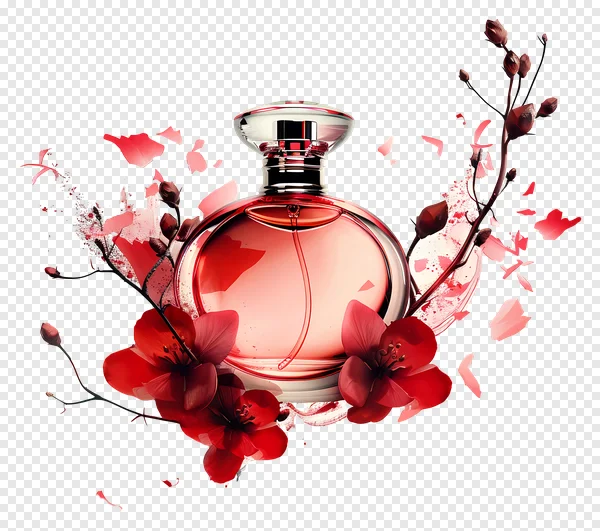 Discover our exquisite free PNG of an elegant perfume bottle, radiating luxury against a dramatic black backdrop. This high-quality image features a stylish, round bottle filled with a vibrant rose-red fragrance, encircled by delicate red floral elements, splashing petals, and artistic strokes. Perfect for beauty blogs, cosmetic advertisements, branding, graphic design projects, or adding a touch of sophisticated allure to your content. Download this stunning, transparent PNG today to elevate your visual storytelling with a blend of classic elegance and modern artistry. Ideal for fashion, beauty, and lifestyle themes, this image offers a premium feel without the cost.