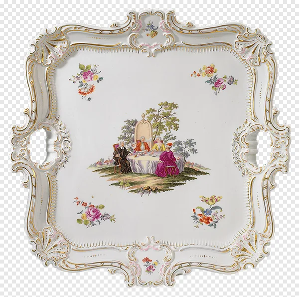 Discover this exquisite antique Rococo porcelain serving tray, a stunning piece of 18th-century artistry. This free PNG features intricate gilded scrollwork, delicate pink accents, and vibrant floral bouquets around its ornate, scalloped edges. The centerpiece depicts a charming fête galante or tea party scene with figures in historical attire amidst a lush landscape. Perfect for vintage design projects, historical presentations, digital scrapbooking, or adding an elegant touch to any creative work. Download this high-quality, decorative platter image for free and infuse your designs with classic European charm today!