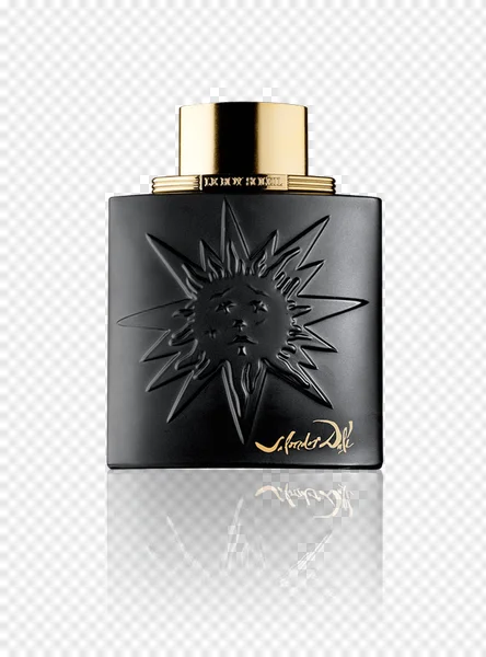 Discover and download this high-quality PNG image of a sophisticated Salvador Dalí perfume bottle for free. The sleek matte black bottle features an intricate embossed golden sun face design, a radiant gold cap, and the iconic Salvador Dalí signature. This luxury fragrance bottle PNG, presented on a dark background with a subtle reflection, is ideal for adding an artistic and elegant touch to your graphic design projects, e-commerce product mockups, beauty blogs, or digital presentations. Enhance your creative works with this premium, transparent background image now!