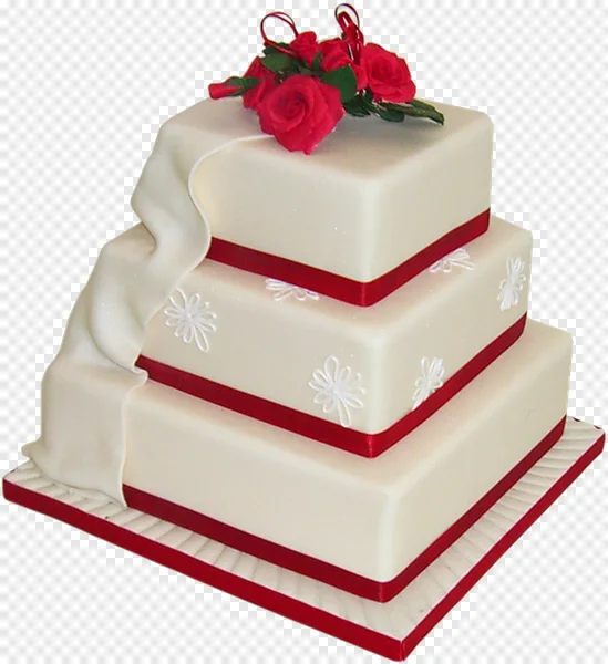 Download this stunning free PNG of an elegant three-tiered square wedding cake. Featuring smooth ivory fondant, vibrant red ribbon accents, delicate white floral piping, and a beautiful topper of red roses with decorative loops, this high-quality transparent background image is perfect for wedding invitations, anniversary cards, party flyers, scrapbooking, or any graphic design project. Add a touch of sophistication and romance to your creations. Get your free clip art download today and celebrate in style!