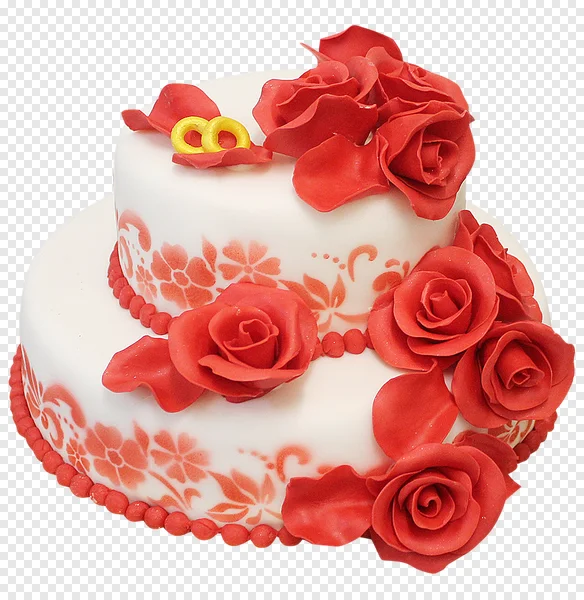 Download this exquisite, high-quality PNG of a two-tier wedding cake for free! This stunning white cake is beautifully adorned with vibrant red fondant roses, delicate red floral stencil patterns, and features a prominent pair of golden wedding rings on its top tier. Perfect for designers, event planners, or anyone looking for a touch of romance and celebration. Use this transparent background image for wedding invitations, anniversary cards, engagement announcements, social media posts, website graphics, or any DIY project that requires a beautiful, ready-to-use cake illustration. Enhance your creative works with this detailed and festive celebratory cake asset instantly!