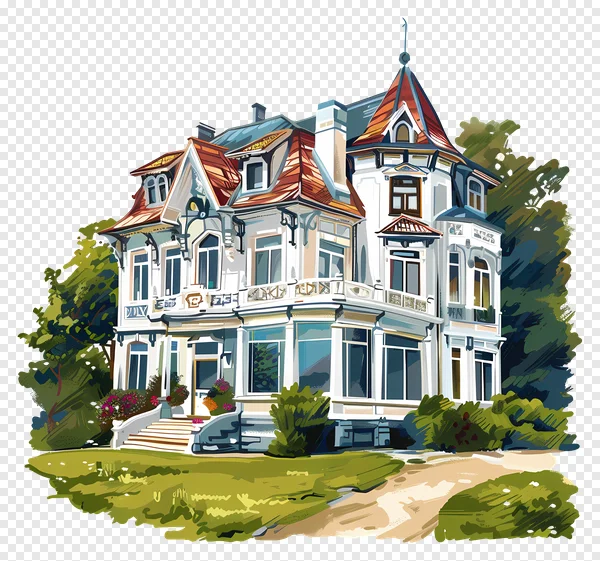 Discover this exquisite free PNG download featuring an elegant Victorian mansion illustration. This detailed image showcases a grand white house with a striking red-tiled roof, a charming turret, ornate bay windows, and balconies, nestled amidst lush green trees and a welcoming garden path. Perfect for architectural projects, historical themes, design assets, website banners, or adding a touch of classic charm to your creative work. The high-quality transparent background makes it easy to integrate into any design. Get this beautiful old house drawing now!