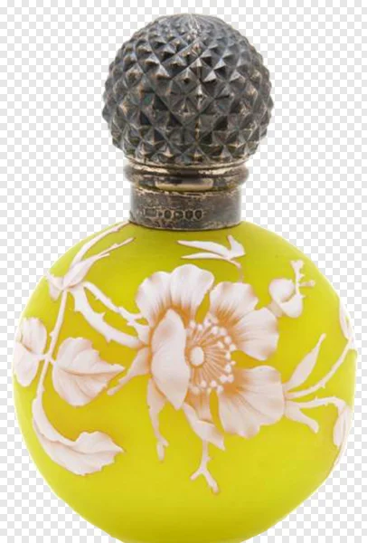 Discover this stunning free PNG of an antique yellow glass perfume bottle, perfect for adding a touch of vintage elegance to your projects. Featuring delicate white floral carvings on its bright chartreuse body and crowned with an ornate silver-toned stopper, this decorative scent bottle is a true gem. Ideal for graphic designers, crafters, bloggers, and anyone needing high-quality, cutout antique imagery. Enhance your designs with this beautiful, transparent background image. Download now for commercial and personal use!
