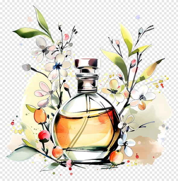 Download this exquisite free PNG image featuring an elegant perfume bottle rendered in a beautiful watercolor style. Adorned with delicate white flowers, vibrant green leaves, and charming red-orange berries, all set against a sophisticated black background, this illustration offers a touch of luxury and natural beauty. Perfect for enhancing beauty product marketing, social media posts, blog graphics, digital art projects, or cosmetic branding. Get this high-quality, transparent design element instantly to add a unique, artistic flair to your creations. Ideal for designers, marketers, and content creators.