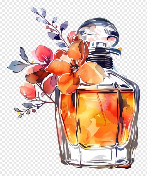 Download this stunning free PNG of an elegant watercolor perfume bottle adorned with vibrant orange and red floral elements. This high-quality illustration features an amber-colored fragrance in a stylish, faceted glass bottle, presented against a transparent background. Perfect for adding a touch of luxury, sophistication, and artistic flair to your beauty blog, social media posts, graphic design projects, website banners, or marketing materials. Ideal for themes related to cosmetics, self-care, feminine products, and stylish aesthetics. Enhance your designs with this beautiful, free, and artistic fragrance image today!