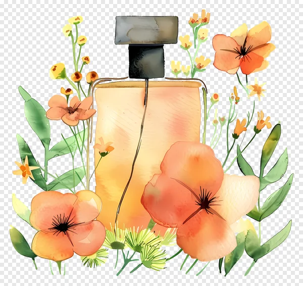 Tags: artistic floral beauty graphic botanical art cosmetic bottle digital art elegant design floral PNG flower border fragrance bottle free download green leaves hand-painted luxury scent nature aesthetic orange flowers peach blooms perfume bottle transparent background watercolor illustration yellow buds